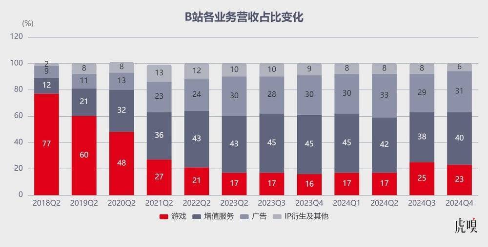 缓缓铺开 B 站 2024Q4 财报会发现,增值服务、广告、游戏和 IP 衍生品及其他四大主营业务贡献占比分别为 40%、31%、23% 和 6% ,与上个季度变化不大。