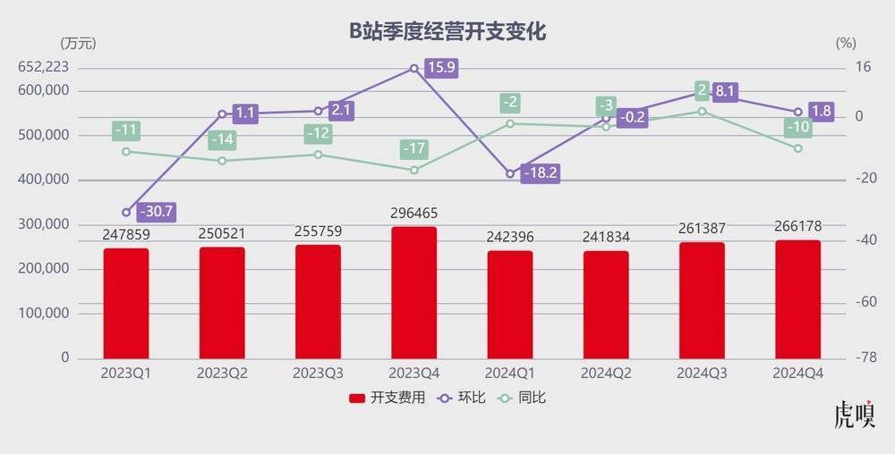 需要强调的是,2024Q4 季度是 B 站首次实现 GAAP 净利润转正,也是真正意义上实现全面利润转正(2023 年同期 B 站净亏损约 13 亿元)。