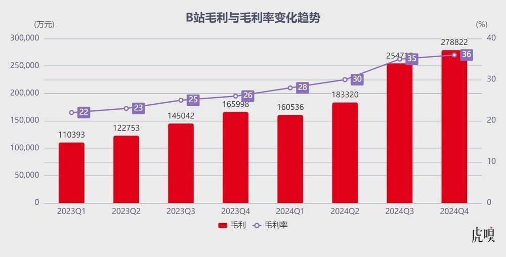 可仔细一琢磨,终究是游戏扛下了大部分新增量:2024Q4 游戏收入同比增长 79% 达 18 亿元,再次站了出来,进而带动 B 站毛利润同比增长 68% 达 27.88 亿元,毛利率更是连续十个季度环比提升至 36.1%。