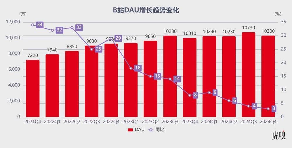 2024Q4 季度 B 站 DAU 达 1.03 亿,环比减少 400 万;MAU 达 3.40 亿,环比减少 800 万。